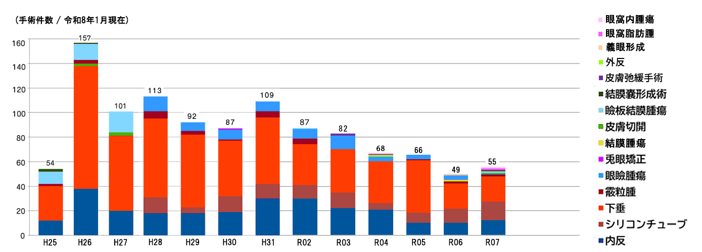 月1回、内反(逆さまつげ)、腫瘍、下垂(まぶたが上がりづらく垂れ下がる状態)の手術を行っています。